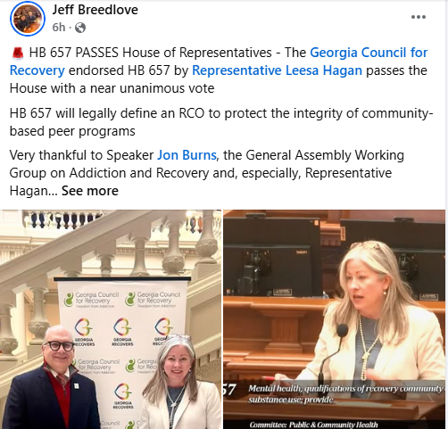 The Georgia Council for Recovery endorses HB 657, passed by Leesa Hagan to define an RCO to protect integrity of community peer programs.