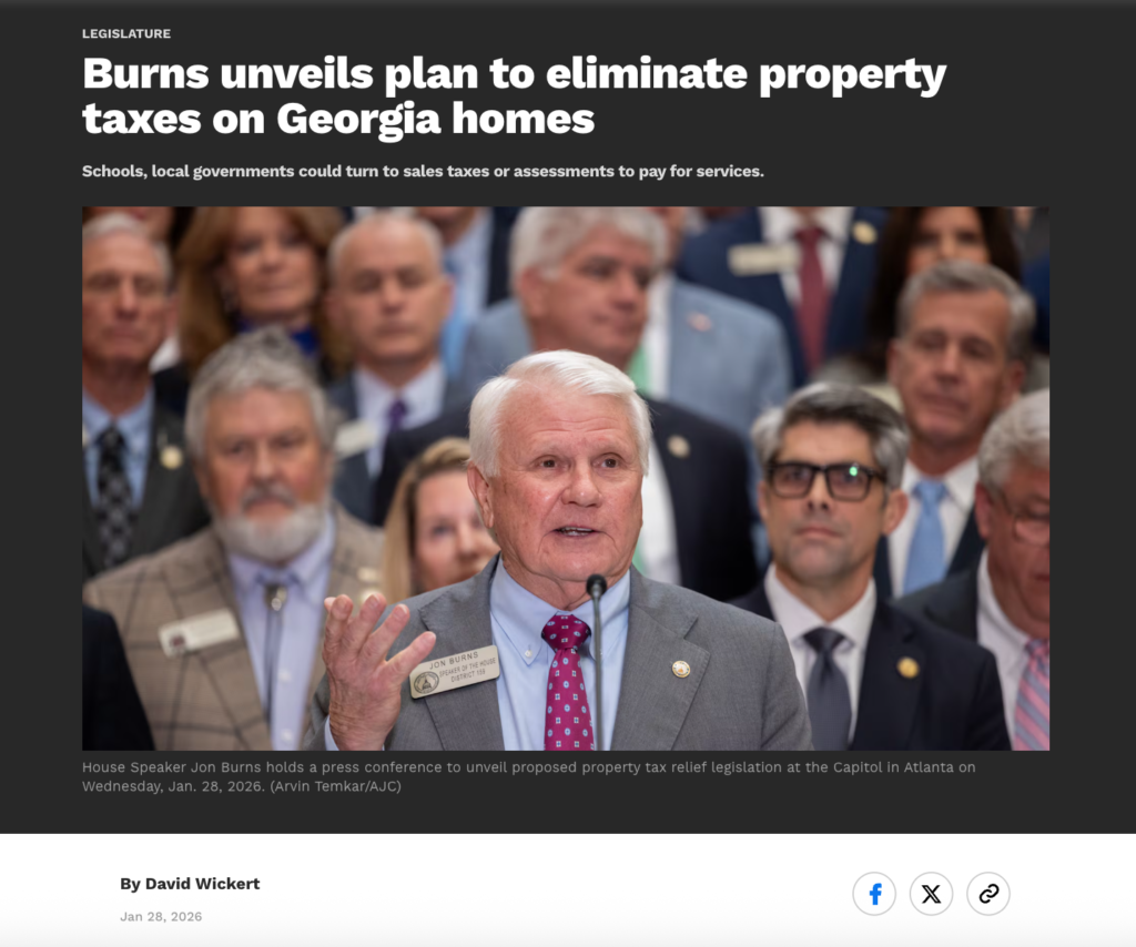 This article from January 28, 2026, by David Wickert goes over House Speaker Jon Burns’ plan to eliminate property taxes on single-family residences, with a plan to phase them out from 2027 to 2032. Property taxes are currently the primary funding source for public schools and services in Georgia, and this bill would eliminate more than $5 Billion per year for these funds. As an alternative, the bill proposes that schools and services repurpose existing sales taxes and begin charging assessments for operations, based on their cost. The reasoning for a bill like this, Burns explains, is to protect homeowners from losing their homes for not being able to pay high property taxes. He explains that “Georgia House Republicans believe no one should ever face the loss of their home because they can’t afford to pay rent to the government.” More on his comments about the bill can be found here. This bill is likely to be favored over bills aimed at eliminating the income tax, as this AJC poll from 2025 shows that while republicans strongly support getting rid of income taxing, while most democrats oppose it, voters on both parties strongly favor property tax reform over scrapping the income tax. The different bills proposed, as well as the poll, show how many different avenues there are for trying to make Georgia more affordable for residents, and different politicians are trying to explore every one of them to increase their chances of making tangible change happen.