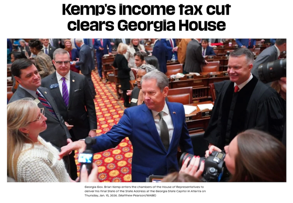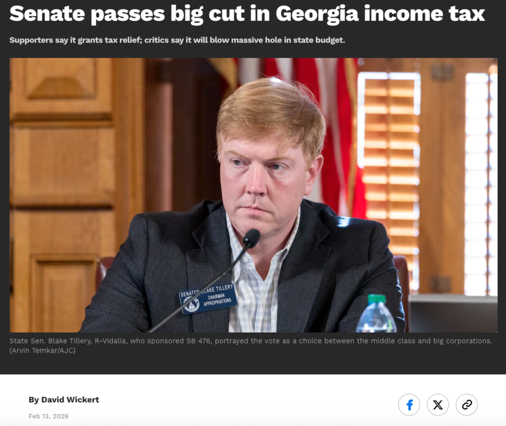 The AJC article written by David Wickert on February 13th of 2026 details two major senate bills that will refine taxation in Georgia for nearly all residents. Early into this year’s session, Republicans have been pushing for affordability within the state. This includes bills phasing out property and income tax. SB 476, which was written by Blake Tillery (R-19) and proposed by governor Brian Kemp in early January. SB 476 as described in the article will reduce income taxes for Georgians from 5.19% to a 4.99% rate and will cover its first year by trimming 2.8 billion dollars worth of tax breaks. SB 477 is also mentioned in this article as another option for another tax relief bill, as it claims to allow reductions of over 2,000 dollars and is also mentioned reducing taxes by 1% from now to 2028. However, both SB 476 and SB 477 have caused debate across the aisle as many Democrats including Kim Jackson (D-41) notes that the reduction of income tax will rise the price of sale rax which will cause a bigger wealth gap between Georgians and mitigate the republican’s push for affordability in the state in the next coming 5 years.